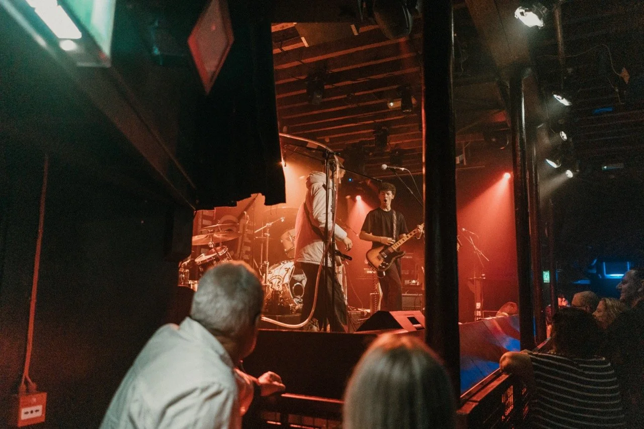 A band performs on stage with four members playing instruments under stage lights, in a dimly lit music venue with audience members in the foreground. View fullsize
