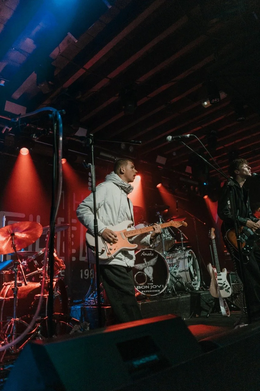 Musicians performing live on stage with guitars and drums under colorful stage lighting, with a Bon Jovi backdrop in the background.