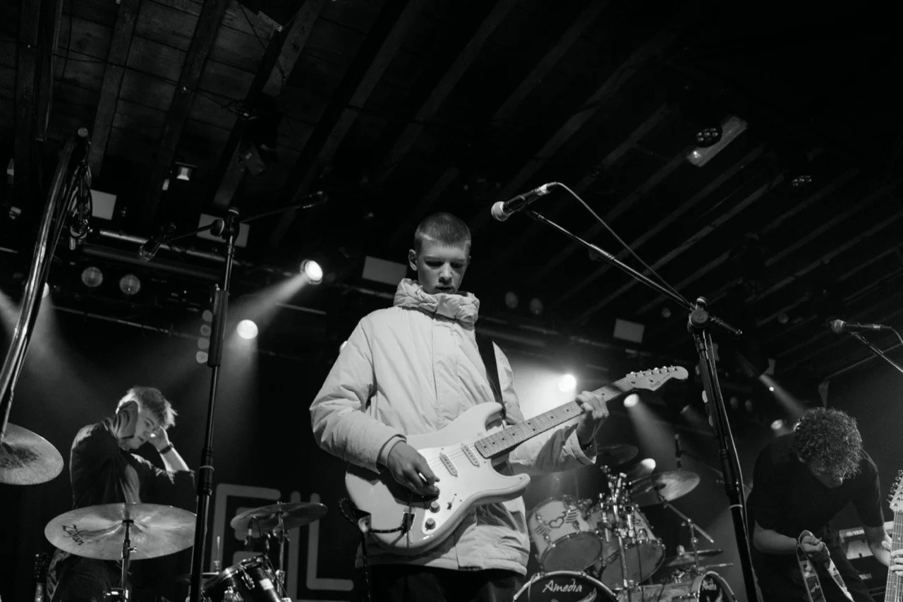 Young band performing on stage with guitars, drums, and microphones in black and white.